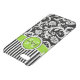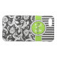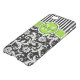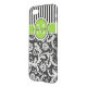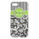 Uncommon’s Clearly™ Deflector iPhone 7 Case with a black and white floral damask and striped pattern background with a decorative lime green band and label that is personalized with a name and monogram.