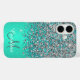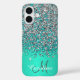 Blue teal and silver PRINTED glitter, personalized with your name and monogram. Faux green brushed metal steel. Mobile iPhone 16 phone case.