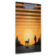 "Midnight Rendezvous: Man and Stag under the Golden Moon" presents a minimalist yet elegant design depicting a peaceful night scene. A man and stag, silhouetted against a starry sky, gaze at a radiant full moon that bathes the scene in a golden light. This artwork, with its black and gold outline, creates a serene and majestic ambiance, inviting contemplation of the universe's vast beauty. The simplicity of the design, focusing on the outlines of the figures and celestial elements, lends sophistication and mystery to the artwork.