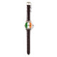 Brown leather perfect square eWatch watch with an image representing Ireland's flag. The green color on the flag represents the native people of Ireland (who are mostly Roman Catholic). The orange color represents the British supporters of William of Orange who settled in Northern Ireland in the 17th century (most of whom are Protestant). The white in the center of the flag represents peace between these two groups of people. Optional clock face. See the entire St. Patrick’s Day Wrist Watch collection in the HOLIDAYS section.