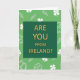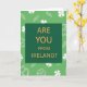This card centers on a dark emerald green square that draws your eyes in right away, like a cozy space where a friendly connection can begin 💚. Inside the square, the words “ARE YOU FROM IRELAND?” sit in gold letters with a slight shadow, giving the message a gentle lift from the surface. The question feels like an easy opener between two people, the kind that invites a smile and a quick back-and-forth. Behind the square, a lighter green background spreads out with white shamrocks, four-leaf clovers, and simple leaf shapes scattered across it ☘️. Some of the clovers are filled in white while others are thin outlines, so your gaze moves around the pattern like you’re spotting little signs meant for sharing. The contrast between the deep center panel and the fresh green field around it keeps the layout clear and balanced. The gold text stays centered within the square, while the white clovers repeat across the background in alternating solid and outline forms.