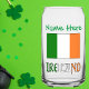 Personalized can glass features a vibrant Irish flag in its iconic tricolor with IRELAND displayed underneath. Above, a space for a name in green letters adds a personal touch. Lovely housewarming gift for a home bar. Perfect for St. Patrick's Day celebrations.