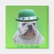 Shown is a photographic image of a white English bulldog wearing a green derbey against a green backing with the text, "Erin Go Bragh".