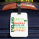 Luggage tag features Subway style graphic lists the top cities of Ireland in various fonts and Irish theme color