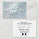 This design feature a white hand lettered "thank you" message with custom text for business name and contact on elegant illustration of blue pearlescent glass background. Includes two social media icons and a field for your username.
