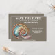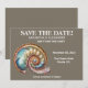 Announce your special day with refined coastal elegance using this striking save the date announcement design. A faux shimmering conch shell, rendered in luminous iridescent tones, rests beautifully against a deep stone brown background—creating a rich, glowing contrast that feels both modern and timeless.