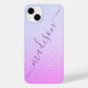 Iridescent Girly Pink Shimmer Personalized Name iPhone 14 Plus Smart Phone Case features a modern pink and blue iridescent shimmer pattern with your personalized name in purple hand written calligraphy script typography. Designed by ©Evco Studio www.zazzle.com/store/evcostudio