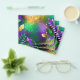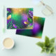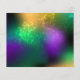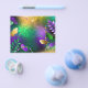 Textural iridescent mardi gras background with spots of purple, yellow and green, decorated with fluffy feathers and shiny beads. Mardi gras holiday.
