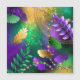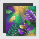 Textural iridescent mardi gras background with spots of purple, yellow and green, decorated with fluffy feathers and shiny beads. Mardi gras holiday.
