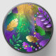 Textural iridescent mardi gras background with spots of purple, yellow and green, decorated with fluffy feathers and shiny beads. Mardi gras holiday.