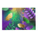 Textural iridescent mardi gras background with spots of purple, yellow and green, decorated with fluffy feathers and shiny beads. Mardi gras holiday.