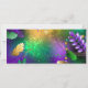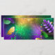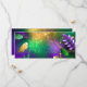 Textural iridescent mardi gras background with spots of purple, yellow and green, decorated with fluffy feathers and shiny beads. Mardi gras holiday.
