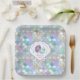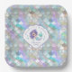 Make waves at your mermaid-themed celebration with this dazzling birthday paper plate! Covered in a watercolor-style mermaid scale pattern in shades of purple, teal, and seafoam green, this sparkling design adds a magical underwater shimmer to any present. The center features a custom label shaped like a clam shell, perfect for personalizing with your child’s name and birthday details. Ideal for birthday gifts, party favors, or matching themed supplies, this pattern brings the ocean fantasy to life — one splash at a time! Search ID1144 to see coordinating products in this design set.