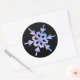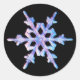 Icy, iridescent, pink, blue & white snowflake, vivid against a black background