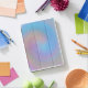 I was super excited when I got my cover in. It is attached by a magnet across the edge. I don’t think it will be very protective but it is very cute. I’m going to keep my iPad in a sleeve and use this face cover while I have it out. It folds to create a tilt for better viewing and to keep the iPad at a slight angle for typing. The colors are bright and it is fun. I’ve really enjoyed it. The personalization looks like amazing. It is the same color as the picture and is the same brightness. Well done! Very nice.