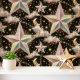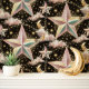 Iridescent Stars and Gold Moons on Black Wallpaper