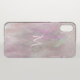 Chic clear iPhone X case with graphics of a pink pearly iridescent background with faux pink glitter, falling down from the top of the case. Personalize the white one letter monogram for yourself or as a fabulous gift idea for her.