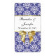 Elegant wedding mini wine labels ready for you to personalize with your own information. Trendy iris blue and white damask pattern, on the top and bottom of the label, with a white text area, in the center, edged on either side with a gold tone line, and a gold tone bow, on the bottom, of the text area. Text is fully customizable to suit your wedding needs. Great for your wedding reception table or gift wines.