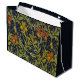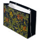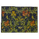 This design features a print of a fabric design created by the British artist William Morris (1834–1896), who is associated with the Arts and Crafts Movement. It depicts blue and orange iris flowers in an elegantly symmetrical pattern. The flower is named after Iris, who was the Greek goddess of the rainbow and a messenger for the Olympian gods, carrying messages down to humanity. The leaves and stems of the iris plants are depicted in blue and green. There are a few yellow birds perching on some of the plants' foliage. The original pattern was designed by William Morris in 1887.