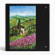 Tuscany landscape,colorful ,vibrant ,expressive beauty of Italian countryside and purple violet iris fields ,beautiful Summer flora in bright green,yellow ,brown,blue ,white colors,meadows,flower field,cypress and olive trees,rustic old farm house under the blue sky and white clouds .Acrylic painting on canvas .