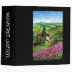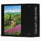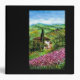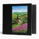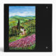 Tuscany landscape,colorful ,vibrant ,expressive beauty of Italian countryside and purple violet iris fields ,beautiful Summer flora in bright green,yellow ,brown,blue ,white colors,meadows,flower field,cypress and olive trees,rustic old farm house under the blue sky and white clouds .Acrylic painting on canvas .