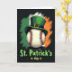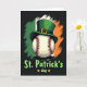 This card features a bright white baseball with classic red stitching, topped with a deep emerald leprechaun hat and a shiny gold buckle ☘️. The hat tilts like it’s being tipped in a friendly, flirty hello, giving the central image a warm, companionable feel. Behind it, wide paint-like swipes form the Irish flag in green, white, and orange across a dark background, making the colors stand out strongly. A soft shadow under the hat adds a little depth while keeping the illustration style simple and graphic. Near the bottom, the words “St. Patrick’s day” appear in bright lime-green lettering, centered beneath the baseball. Small gold stars sit to either side of the text, like little sparks of celebration, with a subtle rainbow-like lift 🌈. The green stripe sits to the left, the white stripe runs through the middle, and the orange stripe lands on the right, all brushed across the dark canvas.
