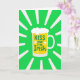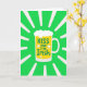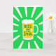 This greeting card features a stylized beer mug centered on a rich green background, setting a festive St. Patrick’s Day scene ☘️. The mug is filled with sunny yellow lager and topped with a thick cap of bright white foam that spills upward in rounded shapes. Across the front of the mug, the text “KISS me! I’m Irish” sits prominently in green lettering, turning the mug into a cheeky invitation that feels like a friendly nudge closer 💚. Small white shamrock icons appear around the wording, like little accents that echo the flirtatious message. Behind the mug, soft white rays spread outward in a starburst pattern, drawing your eye straight to the center. The contrast of green, yellow, and white keeps the design easy to read while still looking lively and party-ready. The mug’s handle is visible on the right, outlined in darker green, with the white rays evenly spaced around it.