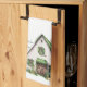 St. Patrick's Day kitchen towel featuring a watercolor illustration of a classic white Irish farmhouse with green shudders, a pair of wellies near the barn door, flowers in window boxes, two butterflies in the shades of the Irish flag, a baby lamb peaking out from the right of the barn, a black and white cow peaking out from the left of the home and a golden retriever laying in the front. To the left of the image, an Irish Blessing - May your troubles be less, your blessings be more and nothing but happiness come through your door in a green font.