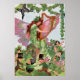 Lucky four leaf clover cover her dress and leprachauns dance around the butterfly fairy as she plays the harp in this vintage victorian children's story illustration.