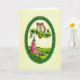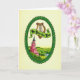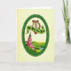 Designed with an ornate scalloped oval frame, the front design is wrapped in emerald leaves with small golden touches that feel like a gentle embrace around the scene 💚. In the center, a multi-tiered pink castle rises from rolling green hills, and its tall turrets are topped with calm blue spires and tiny cross details. Small trees dot the slopes, and little shamrock shapes appear here and there like quiet nods to St. Patrick’s Day ☘️. A river curves through the foreground, catching reflections of the warm golden sky and softening the whole landscape. Near the top, a detailed golden harp hangs like a treasured emblem, with a lime-green banner draped across it as if it’s being carefully held in place. The words “St. Patrick’s Day” sit on the banner in dark, Old English-style lettering, centered and easy to spot against the green. Creamy background tones around the oval help the greens, pinks, and golds stand out without feeling harsh. The harp’s curved frame gleams in gold above the castle, while the banner folds in gentle waves across its strings.