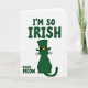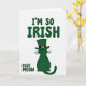 This card shows a white background that lets a deep emerald-green cat silhouette take center stage, wearing a matching leprechaun top hat with a black band and a gold buckle ☘️. The cat’s curved tail and simple whiskers give it a friendly, slightly flirty look, like it’s leaning in for a joke with someone close. At the top, the phrase “I’M SO IRISH” sits in rounded, all-caps letters in the same green, spaced neatly above the hat. Near the lower left of the cat, “RIGHT MEOW” appears as a pun in matching green, angled and tucked close as if it’s a cheeky aside. The limited palette—white, green, black, and gold—keeps the scene crisp and easy to read, with the gold buckle adding a small spark 🌈. With no shading or texture, the design feels modern and graphic, focusing attention on the cat’s confident pose and the witty wording. The hat’s tall shape and the cat’s smooth outline stay centered, while the green text above and the pun below balance the layout across the page.