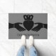 This doormat has a simple hand drawn style illustration of an Irish claddagh heart traditionally found on claddagh rings. The graphic is in black set against a gray background