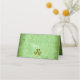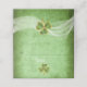 Irish clover and veil green Saint Patrick’s Day wedding folded escort card featuring a green shamrock leaf with gold outline on a white waved veil on green grunge stained background.