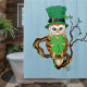 A cute barn owl wearing a green leprechaun top hat with two clovers in it
