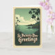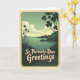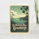 This card shows a calm teal bay along an Irish coastline, with a soft gray-blue sky and rugged headlands fading into the distance. Across the water, an old castle ruin sits in dark silhouette, tucked into rolling green hills that feel like a quiet place you’d wander with a close friend 💚. The palette stays gentle with muted greens, creamy pastels, and deep earthy browns, giving the scene a cozy, close-to-you look rather than anything flashy. In the foreground, large shamrocks and tall grasses rise as darker shapes, as if you’re standing right among them and someone has leaned in beside you ☘️. Light and shadow ripple across the bay, suggesting a small breeze and a shared pause to watch the water. Along the bottom, the words “St. Patrick’s Day Greetings” curve in cream lettering with a soft shadow, set against the darker base so it reads clearly. The shoreline and hills are framed like a vintage travel poster, with the castle centered on the far shore and shamrocks silhouetted in front.