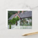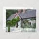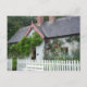 This postcard displays an Irish cottage, decorated with beautiful vines. The place itself is a single-story, pale blue, uninhabited cottage, with a white fence around the perimeter.