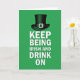 This greeting card features a rich emerald green background that sets a lively St. Patrick’s Day scene ☘️. Near the top center sits a dark green top hat, angled slightly as if tipped in a friendly hello, with soft shading along the brim. A silver buckle on the hat catches the light with a small metallic shine, adding a polished touch against the deep green. Below the hat, the message “KEEP BEING IRISH AND DRINK ON” is arranged in tall, stacked lines, centered and easy to read. The letters are white with a faint shadow that gives them a gentle lift from the green field, like they’re hovering just above the surface 💚. The simple layout keeps your eye moving from the hat down to the words, like a cheerful nod followed by a toast among friends. The overall design stays focused on the hat, the buckle, and the centered white text on the solid green background.
