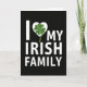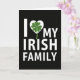 This card features a deep black background with bright white, sans-serif lettering that reads “I” on the left and “MY IRISH FAMILY” to the right, with the missing “love” shown as an icon instead of a word. In the center sits a white heart that feels like a quiet hug tucked into the statement, hinting at closeness and loyalty. Inside the heart is an emerald green four-leaf clover ☘️, the only strong color on the card, drawing your eye like a little shared secret between loved ones. The clover’s four rounded leaves and single stem are clearly defined, adding a touch of natural texture against the smooth, flat shapes. The spacing keeps everything easy to read, with the heart-and-clover symbol acting as the bridge between “I” and “MY IRISH FAMILY,” like a link that holds everyone together 💚. The overall look stays minimal and high-contrast, letting the simple layout carry the warmth without extra decoration. The white text and heart sit sharply against the black field, while the green clover glows at the center of the heart.