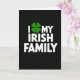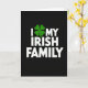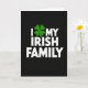 At the center of the card is a velvety black background that makes the message feel close and focused, like a family gathered shoulder to shoulder. Across the middle, the words “I ☘️ MY IRISH FAMILY” sit in large white capital letters, arranged in a neat, centered stack. The shamrock stands in for the word “love,” and its emerald green adds a gentle romantic note, like a quiet squeeze of the hand between relatives or friends 💚. The letters look slightly raised, with soft shadowing that gives them a cut-out, touchable look. A faint grainy texture on the white type suggests a matte finish rather than a glossy shine. The green clover has three rounded leaves and a short stem, sitting snugly between “I” and “MY” as the only strong color on the front. Share St. Patrick's Day sentiments with someone you care about.
