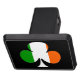 The bright green, orange, and white stripes of the Flag of Ireland fill up the traditional shamrock shape. The image is placed on a dramatic black background. Proudly show your Irish side!