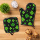 Black and green oven mitt and pot holder set with Irish theme. Bright green four-leaf clovers cover both items, which can be purchased together or separately. Perfect for all lucky chefs, or maybe the chef who needs some luck in the kitchen.