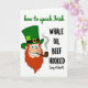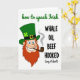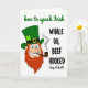 This greeting card shows a cheerful leprechaun on the left against a white background, his rosy cheeks, wide blue eyes, and big grin giving him a friendly, flirty charm 💚. He wears an emerald green top hat with a black band and a gold buckle, topped with a shamrock that echoes the St. Patrick’s Day theme ☘️. A thick red beard and matching sideburns frame his face, and a brown pipe rests near his mouth as a thin curl of gray smoke rises upward. On the right side, the joke is carried by stacked text, balancing the character like a conversation partner across the page. Near the top, “how to speak Irish” appears in green, flowing lettering, centered across the upper area. Beneath it, “WHALE OIL BEEF HOOKED” is set in large black all-caps, with “(say it fast)” in smaller black type underneath to cue the punchline. The simple white space keeps the green hat, red hair, and black text crisp and easy to spot, and it’s a fun way to share St. Patrick’s Day sentiments. A small, soft gray smoke trail curls above the pipe near the left side of the card.