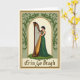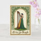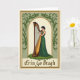 Designed with an elegant Irish scene, the card shows a calm woman in a deep emerald gown seated on a small patch of green grass, gently playing a golden harp 💚. Her fingers rest lightly on the strings, and her focused gaze feels tender, as if she’s playing for someone close by. The image sits inside a soft arched window, giving the moment a quiet, sheltered feel. Around the arch, dark green Celtic vine shapes curl and weave, dotted with small shamrock touches ☘️. The palette stays in sage and forest greens with earthy gold, like a misty hillside lit by warm afternoon sun. Along the bottom, the words “Erin Go Bragh” appear in dark green lettering, centered and easy to spot against the lighter background. The harp’s gold frame curves upward beside her flowing dress, with fine strings drawn in delicate lines inside the arch.