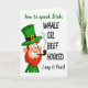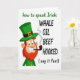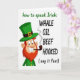 Designed with a cheeky Irish joke in mind, the card shows a cartoon leprechaun standing on the left against a white background, grinning as if he’s letting you in on a secret 💚. He wears an emerald-green top hat with a gold buckle and a matching green jacket dotted with yellow buttons, and his fiery red beard and raised eyebrows add to his friendly, teasing look. A pipe sits between his teeth, and a thin curl of gray smoke drifts toward the words on the right, like he’s nudging a friend to read along. Near the upper right, the line “how to speak Irish:” appears in green lettering, set apart so your eye lands there first. Below it, the phrase “WHALE OIL BEEF HOOKED” is written in large, black, hand-drawn letters, taking up most of the right side. Just under that, “(say it fast)” appears in smaller black text, turning the joke into a shared little dare between two people ☘️. The leprechaun’s bright hat band and the soft gray smoke sit close to the green headline, while the big black phrase dominates the lower right area.