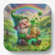 An Irish leprechaun holds a mason jar filled with gold coins surrounded by lush green hills and under a vibrant rainbow