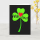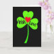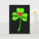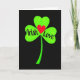 This card features a three-lobed shamrock in bright emerald green set against a deep, velvety black background, with a small red heart tucked where the three leaves meet, like a quiet promise between two people. Soft shading across the leaves makes the green look lightly kissed by light, giving the simple shape a gentle depth. The word “Irish” stretches in black lettering across the left leaf, curving to follow its edge. “Love” appears in matching black lettering across the right leaf, balancing the layout so the message feels naturally woven into the plant. The glowing green and the crimson heart create a cozy contrast that reads like friendship turning into something closer 💚. The dark backdrop keeps the focus on the shamrock and heart, letting the design feel intimate rather than loud ☘️. The center point is a crisp, bright red heart nestled tightly at the junction of the three heart-shaped leaves.