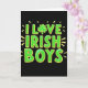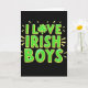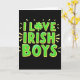 This greeting card centers on the phrase “I LOVE IRISH BOYS” set in glowing green letters against a deep black background, giving the design a night-sky contrast. The words sit in three stacked lines right in the middle, and the glossy, 3D-style lettering looks like it’s catching light as if you’re leaning in closer. A bright yellow outline traces each letter, and tiny yellow bursts flick out from different corners, like little sparks that make the message feel excited and flirty 💚. The “O” in “LOVE” is replaced by a neat three-leaf clover, adding a sweet Irish touch that reads like a wink ☘️. The green and yellow pairing keeps the focus on the statement while still feeling festive and modern. The black background stays uncluttered, so the central text feels like it’s floating forward with extra depth and shine. Small yellow ray marks appear around several letters, with the clover-shaped “O” sitting snugly in the middle of the word “LOVE.”