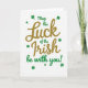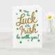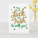 This greeting card centers on the Irish blessing “May the Luck of the Irish be with you!” set on a bright white background, with the words arranged to feel close and connected like friends leaning in for a toast 💚. “Luck” and “Irish” sit prominently in the middle in a golden-bronze, flowing calligraphic style that looks lightly shimmering. The smaller words “May the,” “of the,” and “be with you!” wrap around them in emerald green lettering, guiding your eye in a gentle curve from top to bottom. The warm gold against the green creates a cozy, celebratory contrast, like a shared laugh across the table on St. Patrick’s Day. Around the text, little four-leaf clovers and shamrocks are scattered in different sizes, some drawn like tiny green starbursts and others as fuller leaf shapes ☘️. The spacing keeps everything easy to read while still feeling lively, with the clovers filling the open areas without crowding the message. Several small shamrocks float near the corners and edges, framing the center words with soft green accents.