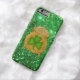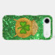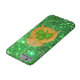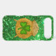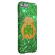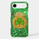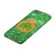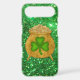 Fun Irish design with faux sparkle and bling for a magical look. Background is printed green glitter with a leprechaun's golden pot of gold filled with coins. Green lucky shamrock clover on pot.