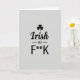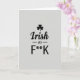 This greeting card features a minimalist layout on a light grey background, centered around the phrase “Irish as F**K” in black lettering with a small shamrock above it ☘️. “Irish” appears in a flowing cursive style, giving it a smooth, affectionate feel, like a wink shared between close friends. The tiny word “as” sits between two thin horizontal lines, acting like a quiet bridge that keeps the whole design balanced. Below it, “F**K” is set in large uppercase letters, and the asterisks soften the word without hiding its punch. The contrast between the gentle curves of “Irish” and the sharp, straight lines of the final word adds a teasing, flirty edge 💚. Everything is evenly lit and sharply defined, so the black text and symbols stand out clearly against the pale backdrop. The shamrock is centered above the text, with its simple leaf shape neatly aligned over the first word.